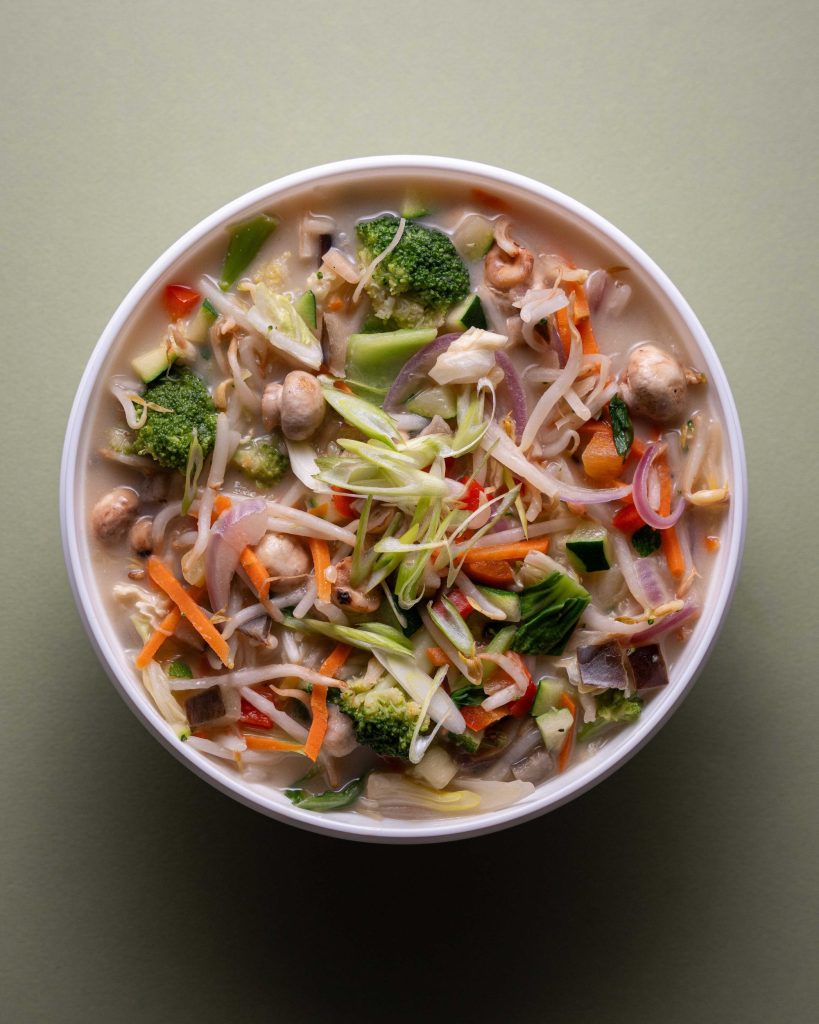 Felix assistiert bei der Versorgung vieler Gäste in kurzer Zeit mit frischen, gesunden, heißen Gerichten. Die Bowls stehen per Förderband bereit.